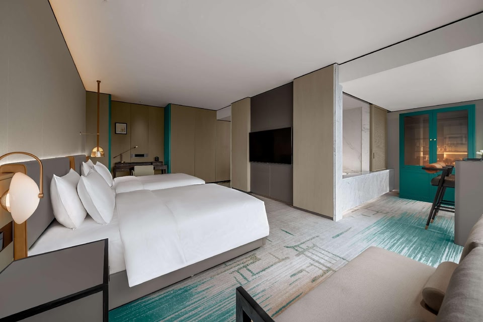 Jade Bay Hotel is a cultural experience hotel themed around Lingnan culture and Shunde local characteristics. The hotel uses elegant architectural lines and artistic furnishings to outline layers of culture, art, and lifestyle, making it a unique urban landscape. The hotel stands 23 stories high and features suites that integrate distinctive cultural elements into their design. Guests can enjoy views of the Desheng River to the front and the bustling cityscape to the back, making it a rare place where urban vibrancy and tranquility coexist.