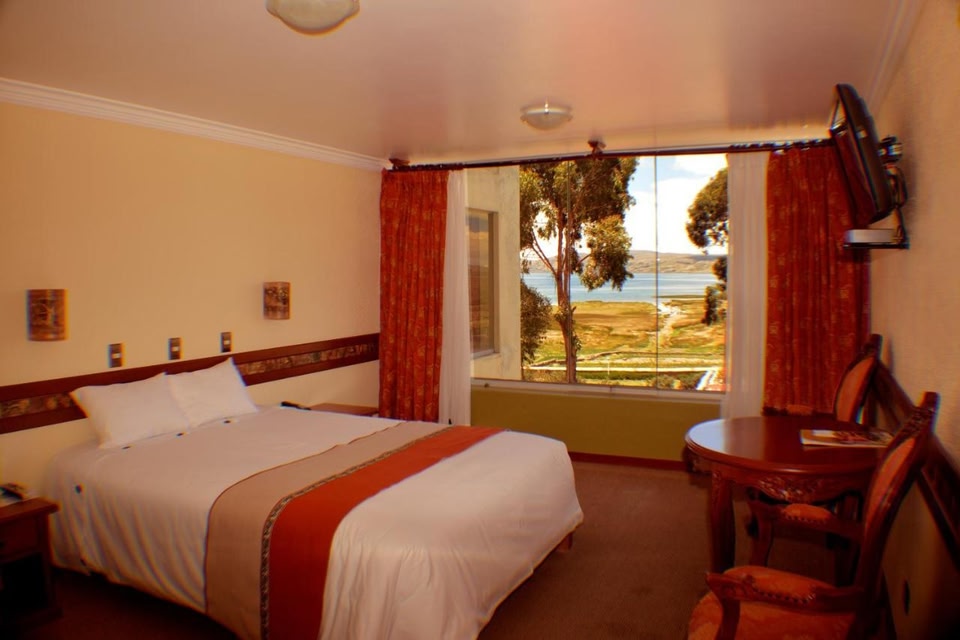 An indoor swimming pool, landscaped water fountains and a hot tub can be enjoyed on the shores of Titicaca Lake. Guests can book a massage and enjoy the meditation area. Rooms have direct lake views.